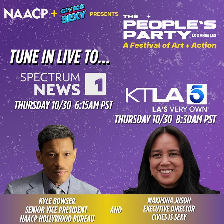The buzz has already begun across Los Angeles. Today, I will have the honor of sharing the vision behind The People’s Party on KTLA Morning News and Spectrum News 1, and with our radio family on KJLH 102.3 FM and KBLA Talk 1580 alongside the incredible Kyle Bowser, SVP of the NAACP Hollywood Bureau.